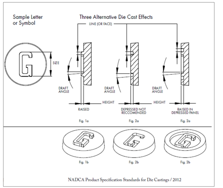 Such as-cast ornamentation may be raised or depressed, but note that raised lettering will result in lower die construction costs and reduced die maintenance over the life of the die.Raised lettering on a depressed panel can be an economical substitute for depressed letters, as shown in the illustration below