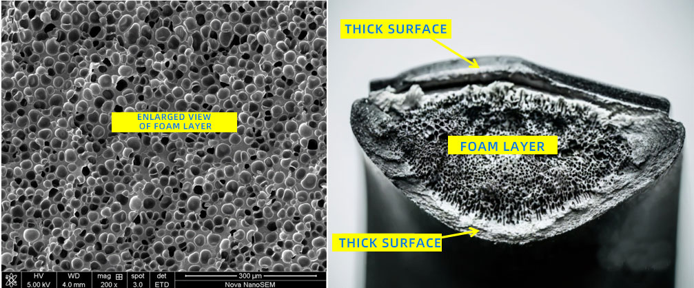 The micro foaming technology is used to form a honeycomb cell structure inside the product through extrusion, injection molding, hollow and other molding processes. After the product is planed, the cross section area looks like a sandwich structure. With a thick surface layer at the top and bottom, and a foam layer with a microporous structure in the middle.