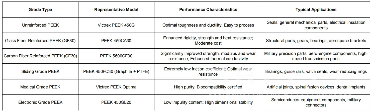 PEEK can be divided into various types according to different classification criteria. In terms of purity, it is mainly divided into pure PEEK and reinforced PEEK; after adding filling materials to PEEK to change its properties, it is classified into wear-resistant, thermally conductive and flame-retardant types according to main functions.
