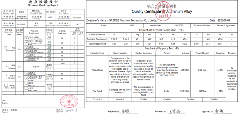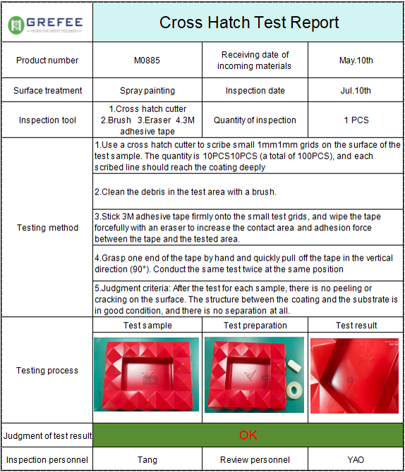 Besides the standard dimension report, for products with surface coatings,we also provide tests including cross-cut adhesion test, coating thickness, adhesion strength, fire resistance, and salt spraying test etc