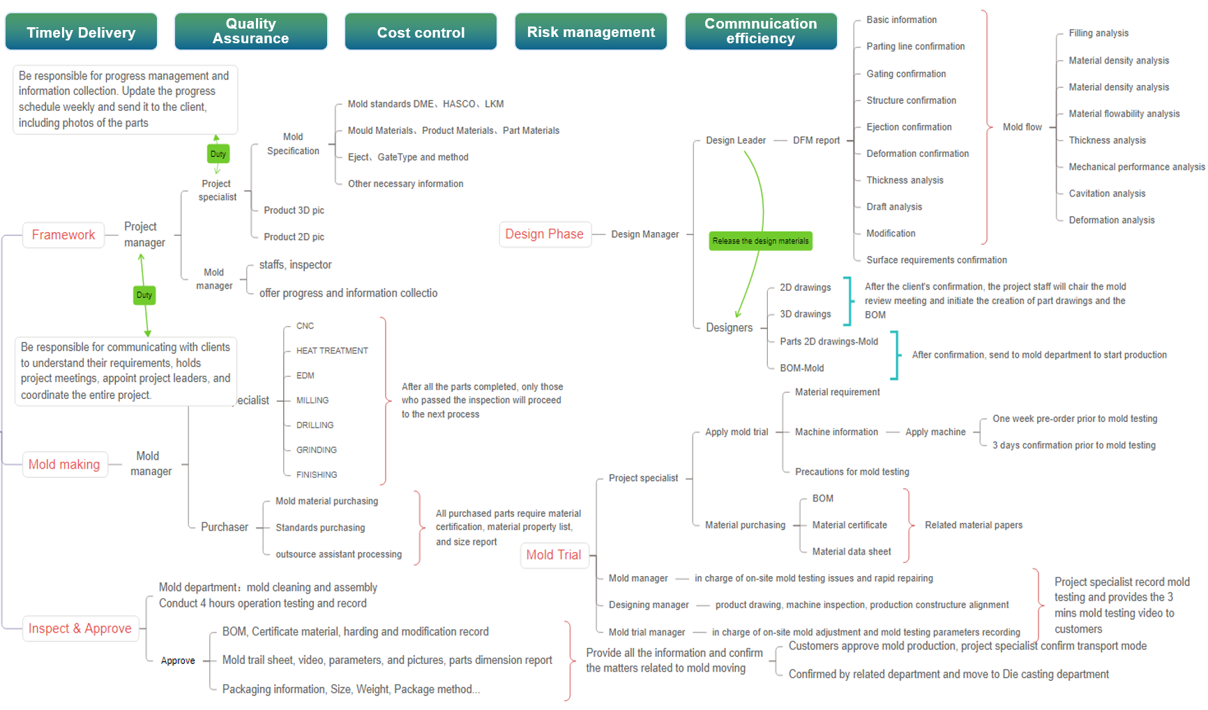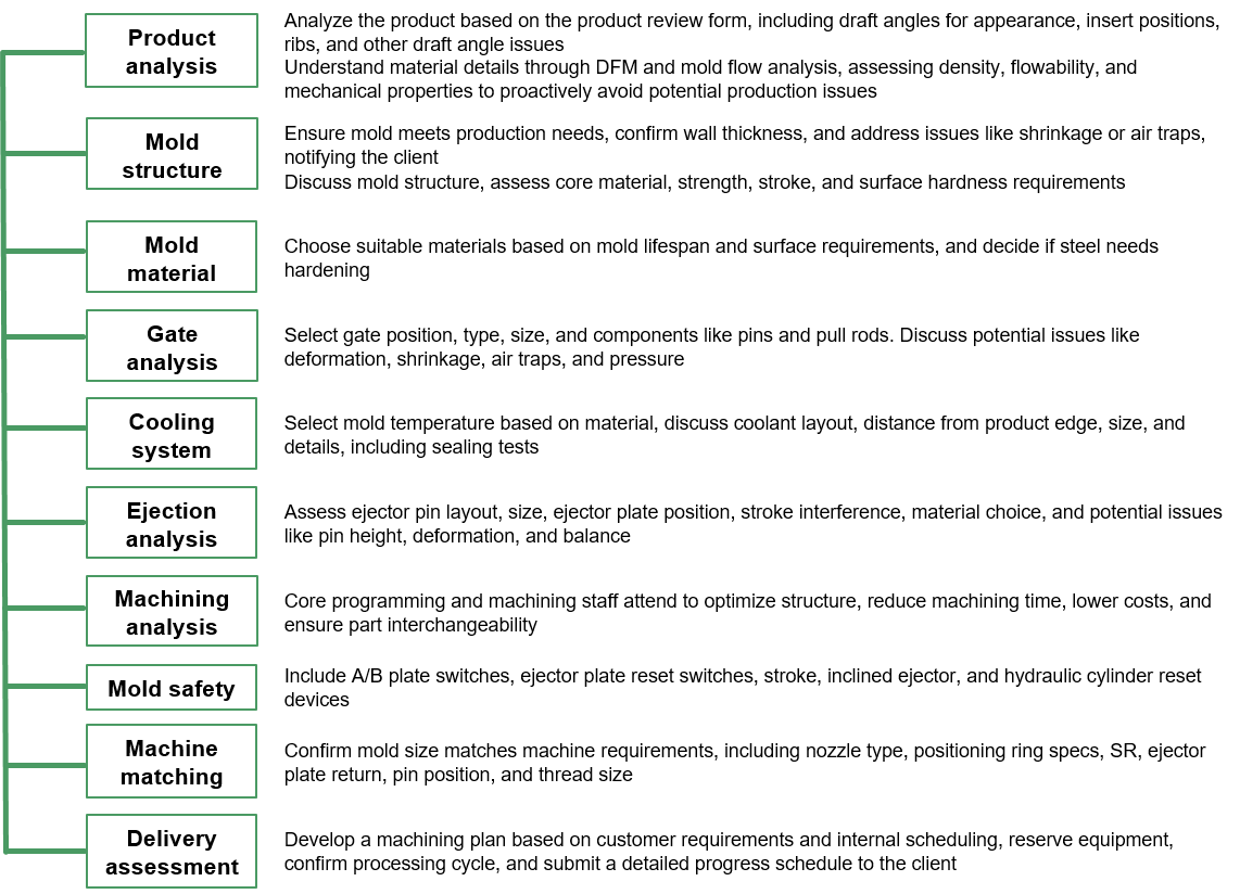 The final mold review is conducted based on product drawings and machine specifications to ensure the mold meets customer requirements. Additionally, an evaluation is carried out with various departments to ensure both mold quality and delivery timelines are met.