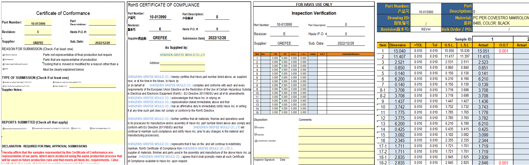 Organize and compile relevant documents, including Certificate of Conformance, Dimensional Report, and RoHS Compliance. Submit to the client, and proceed with mold processing only after document confirmation.